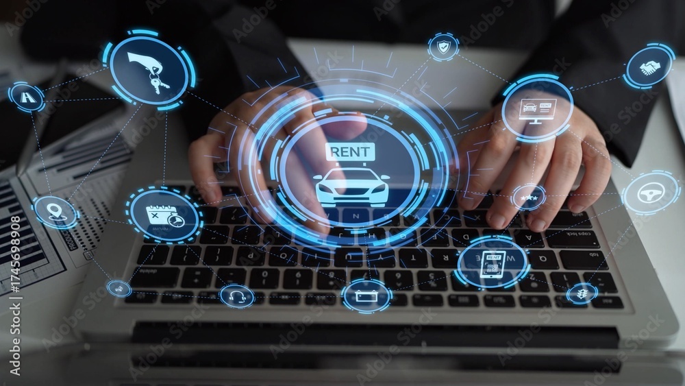 Online car rental service with booking, GPS, key handover and vehicle sharing icons representing modern mobility, travel convenience and digital rental platforms. Funnel #1745698908