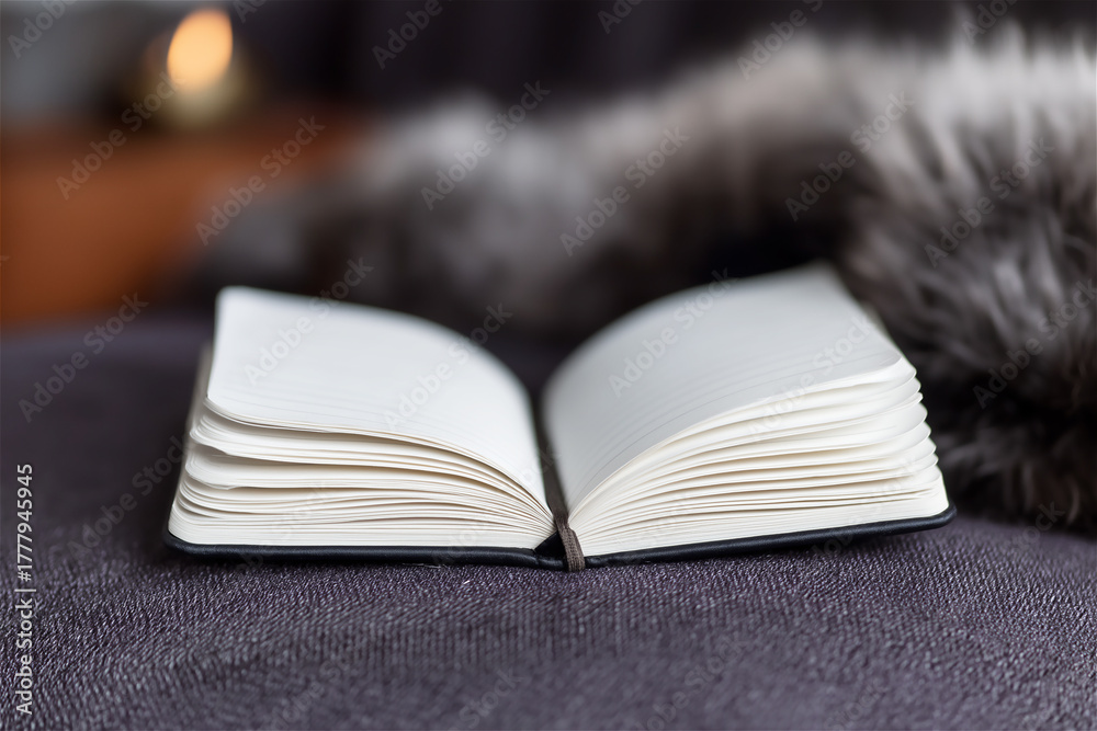 Open book on a soft surface with cozy, warm lighting, creating a relaxing and peaceful atmosphere for reading or contemplation. #1777945945