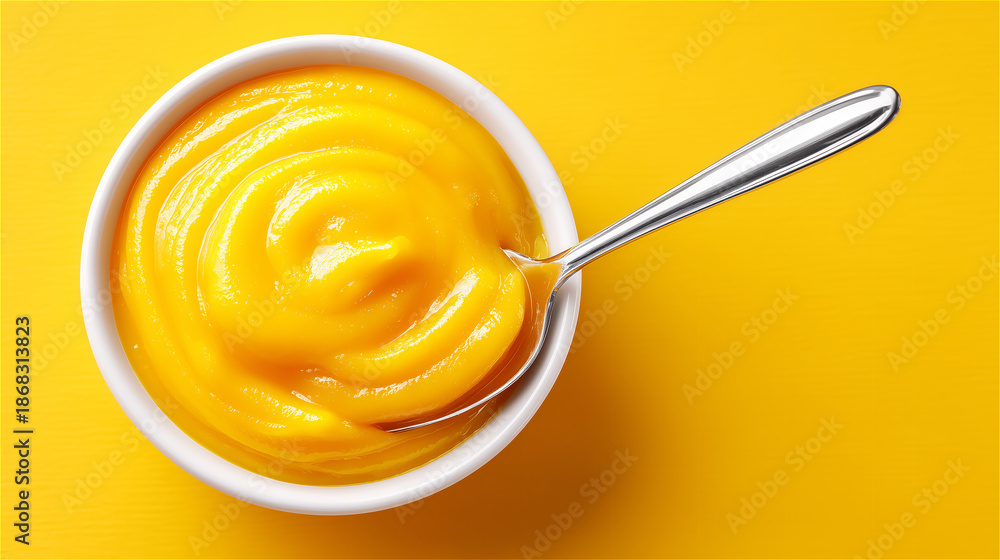 Orange pumpkin puree or mango smoothie in bowl with spoon on yellow background, minimal flat lay. Bright healthy food, baby-friendly meal or vegetarian dessert concept, copy space. #1868313823