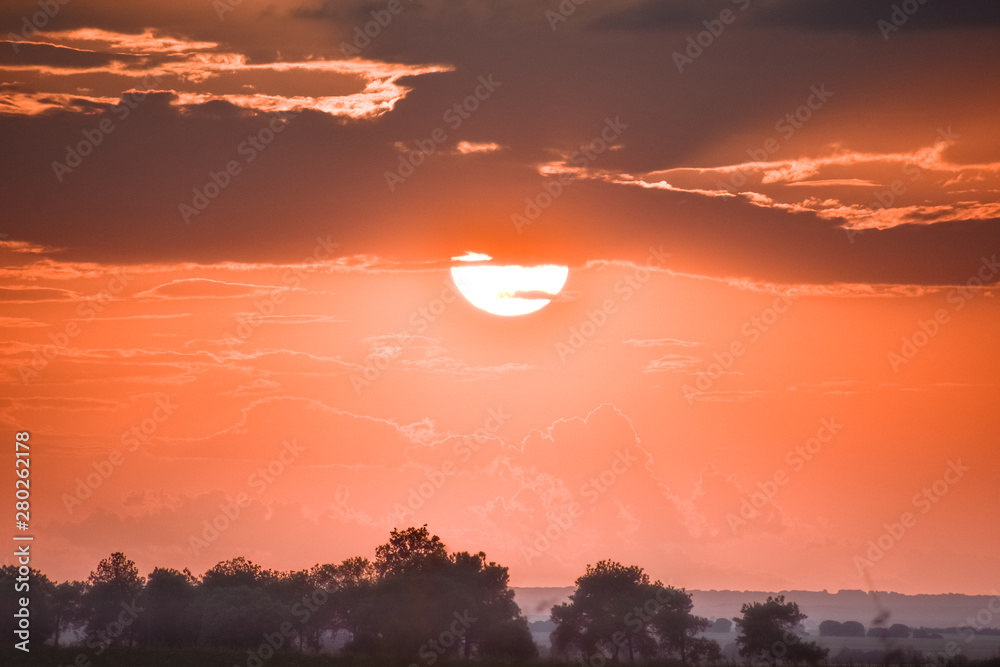 Orange sunset in nature. Sun between the clouds, and foggy ground and trees. #280262178