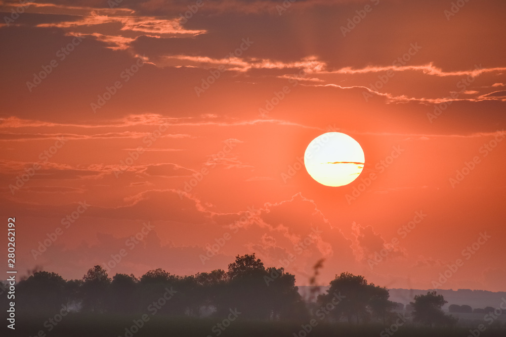 Orange sunset in nature. Sun between the clouds, and foggy ground and trees. #280262192