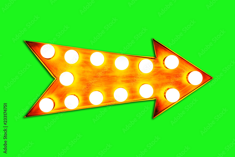 Orange, yellow and red illuminated metallic display golden arrow sign with glowing light bulbs isolated on vivid bright green background. #233174751
