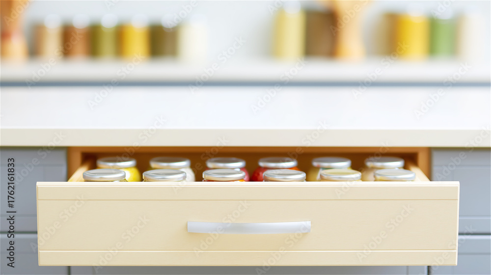 Organized kitchen drawer filled with glass spice jars, concept of home organization, cooking and clean lifestyle. #1762161833