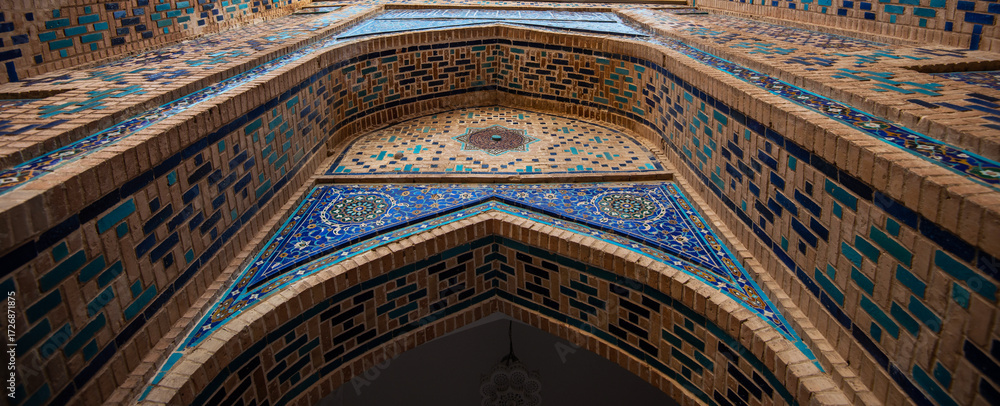 Ornate Islamic architecture with blue mosaic tile work and detailed geometric patterns on a brick facade, photographed from below within the historical necropolis complex in Samarkand, Uzbekistan. #1726871875