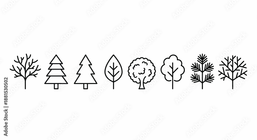 Outline Tree Silhouette Icons Set – Pine Oak Round Bushy and Branchy Trees Line Art Vector Collection #1881530502