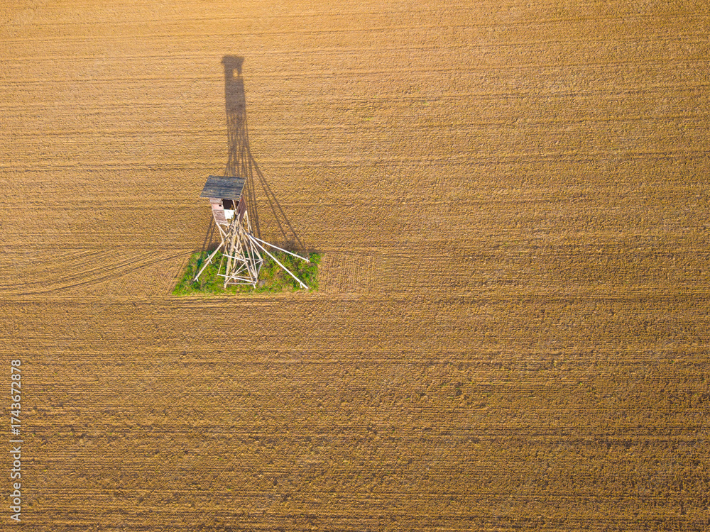 Overhead view of a hunting blind, high seat in the middle of a field casting a long shadow #1743672878