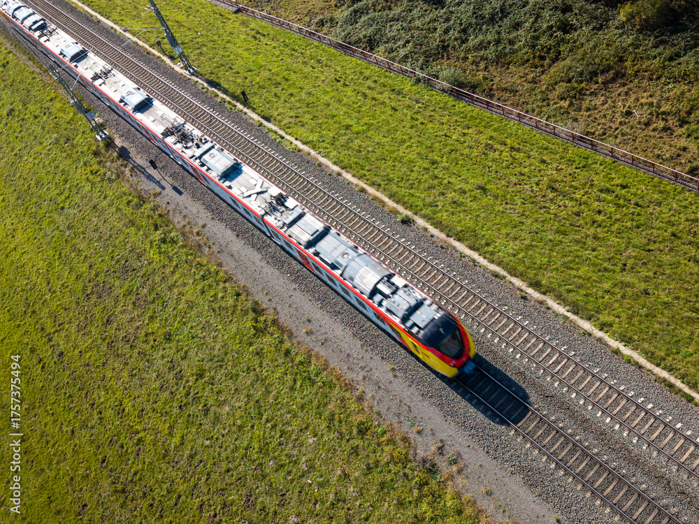 Overhead view of the train traveling on the dam in bright sunlight #1757375494