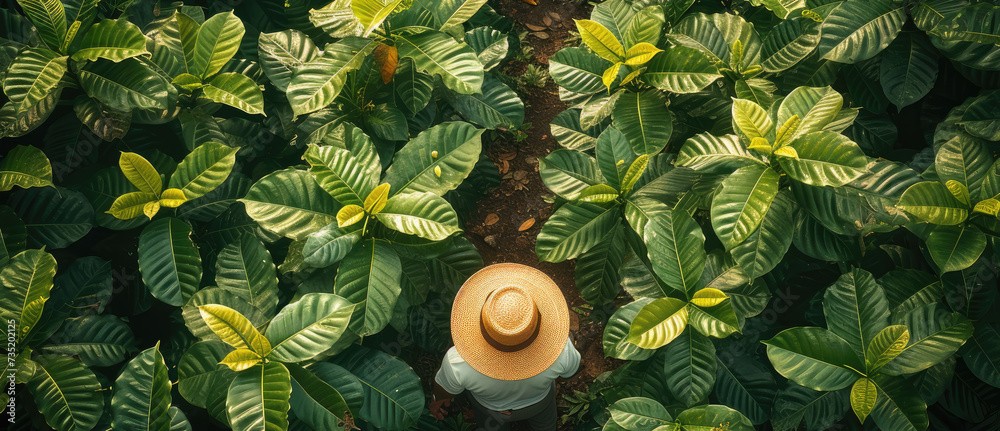 Overhead view of with coffee plantation and gardener. Generative AI. #735202125