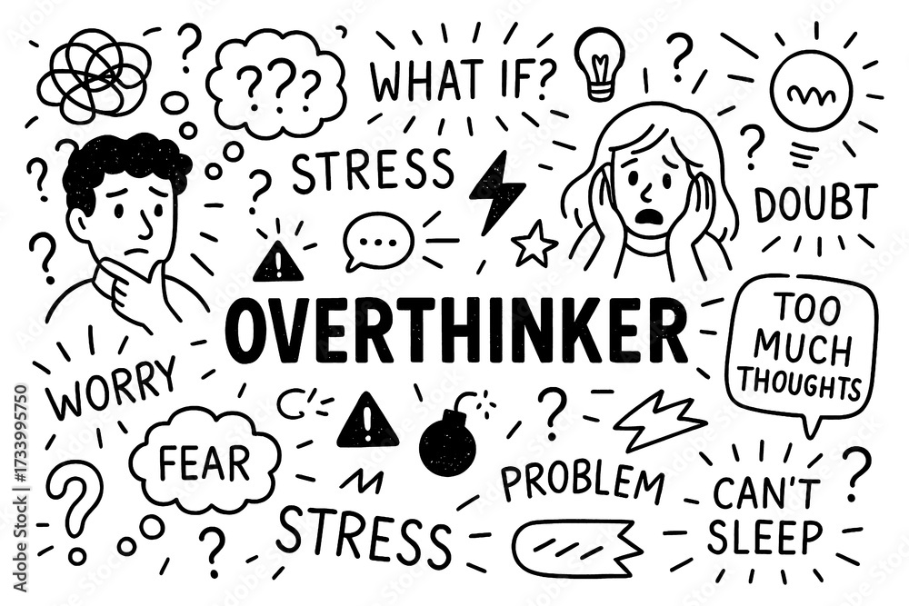 Overthinking doodle composition with anxious people, thoughts, symbols and stress elements, Transparent Background #1733995750