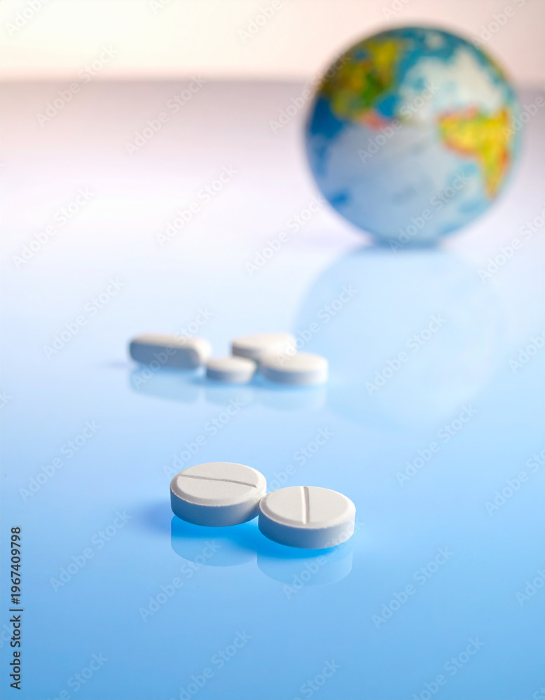 Pair of pills in foreground with blurred world globe and medication on light blue background. #1967409798