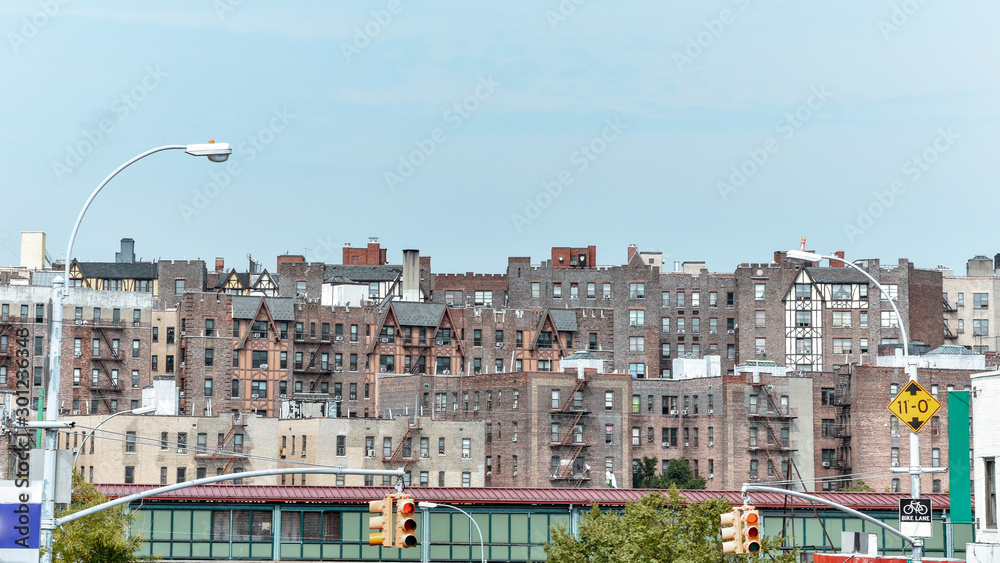 Panoramic roof view of old houses. Brick buildings with fire stairs during the day. Travel and housing concepts. Bronx, NYC, USA #301236343