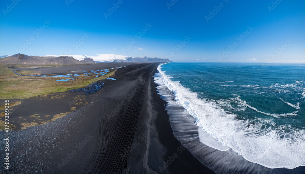 Panoramic View of Black Sand Beach and Blue Ocean in Iceland aerial view #1707289055