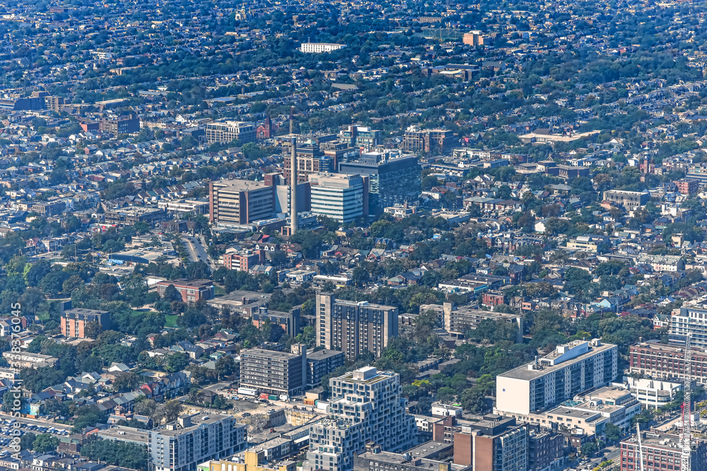 Panoramic view of the city of Toronto, with residential areas and a factory downtown. City concept. Toronto, Ontario, Canada #338376045