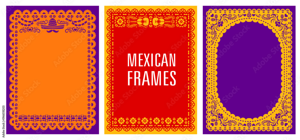 Papel picado Mexican fiesta frames, Hispanic holiday borders with decorative floral ornament. Traditional vector fiesta, dia de Muertos and Cinco de mayo celebration festive paper cut folk templates #1966518203