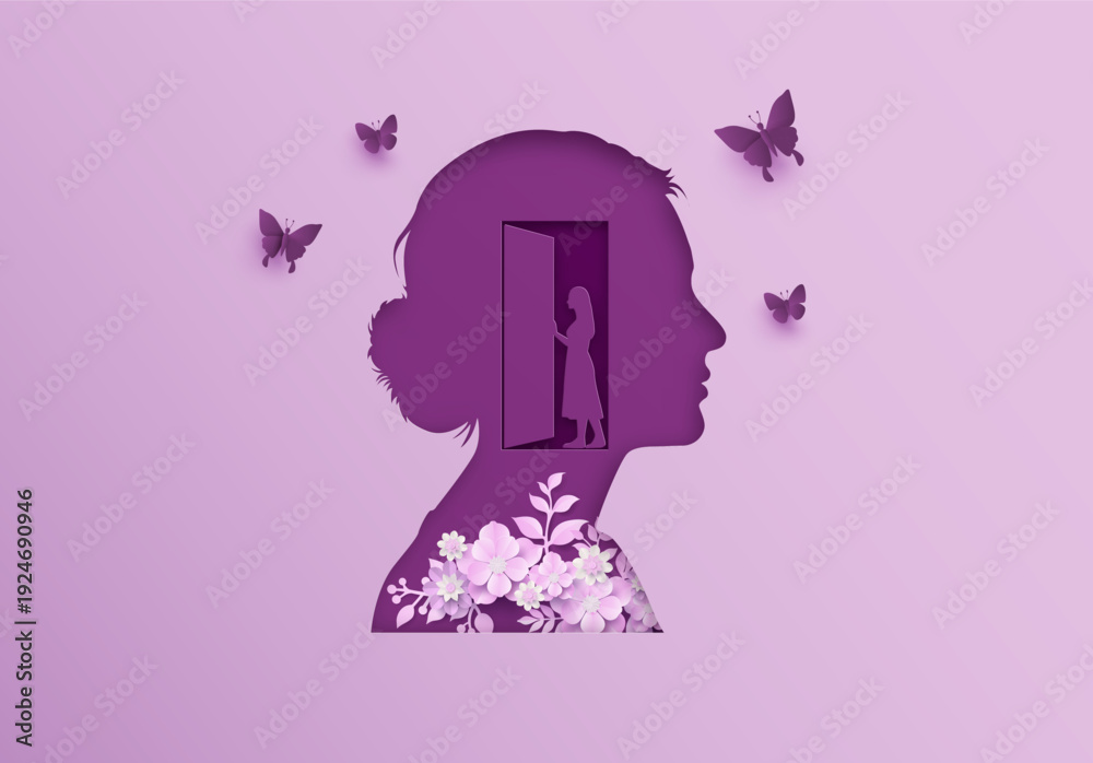 Paper art style vector illustration of a woman profile silhouette with an open door inside her mind and flowers, inner potential concept. #1924690946