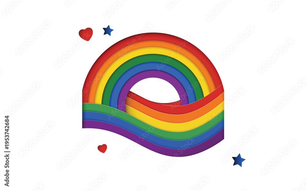 Paper art style vector illustration of diverse people celebrating Pride Month with a large rainbow heart, hot air balloon and flag. Love and diversity concept. #1953742684