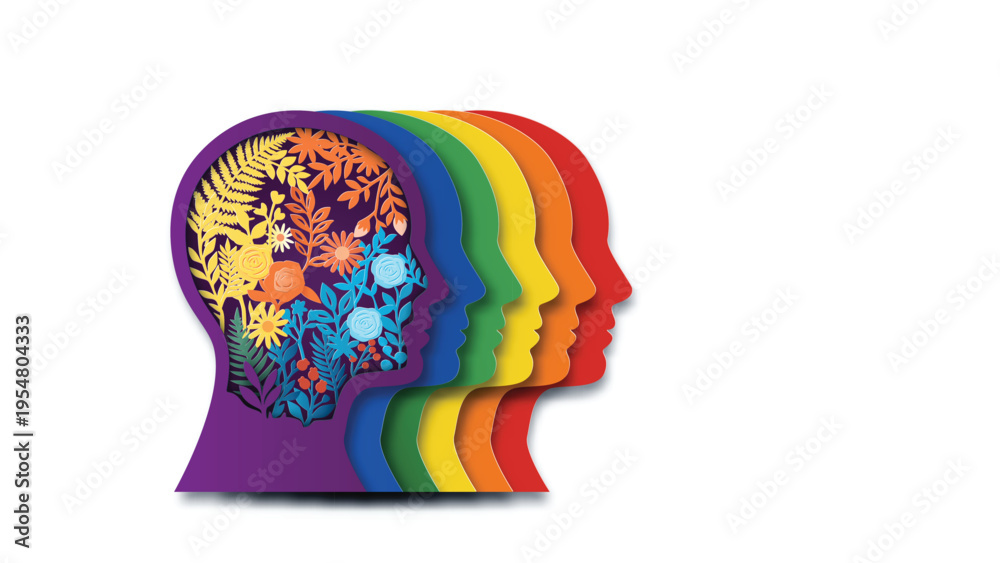 Paper art style vector illustration of diverse people celebrating Pride Month with a large rainbow heart, hot air balloon and flag. Love and diversity concept. #1954804333