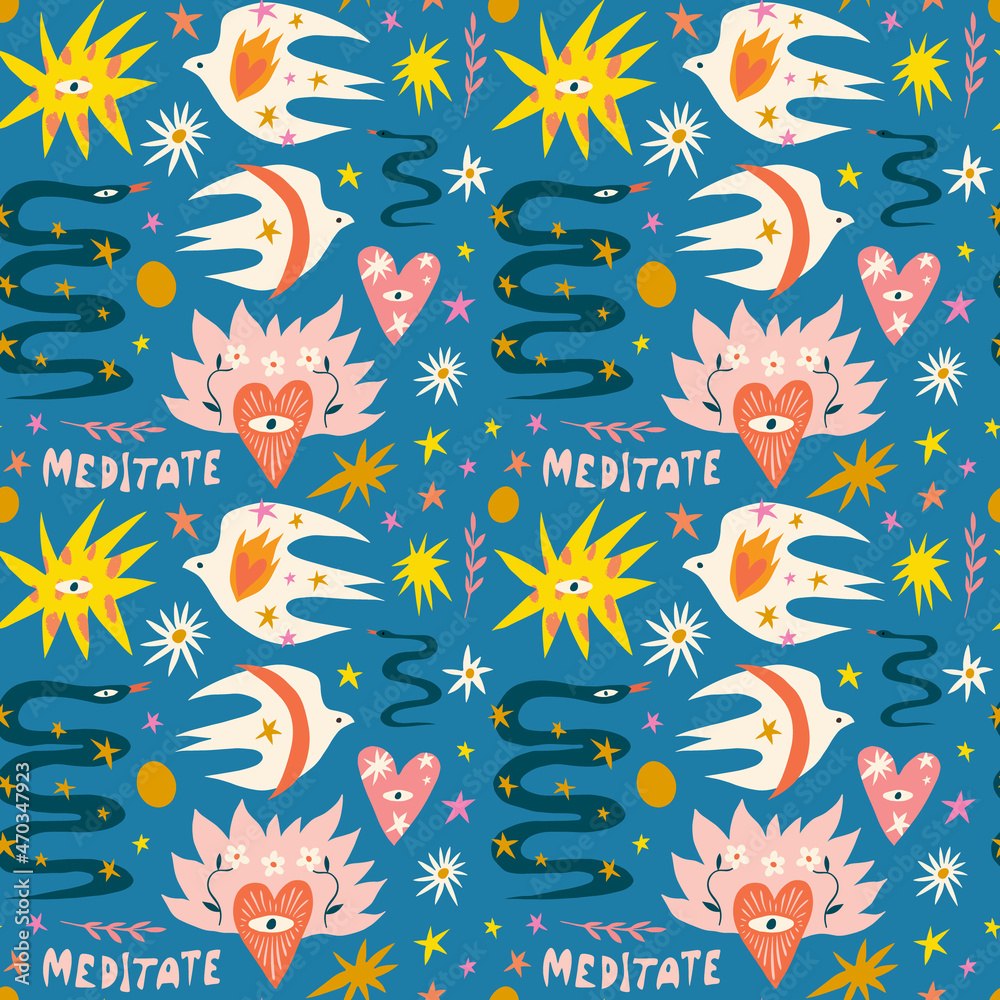 Peace and love doodles childish cartoon boho naive funky handdrawn style art seamless pattern #470347923