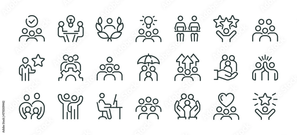 People crowd, person group, human resources, team work icons pack. Line signs office worker and employees group, staff people. Thin vector icons set for web and app outline pictograms editable stroke. #1710309442