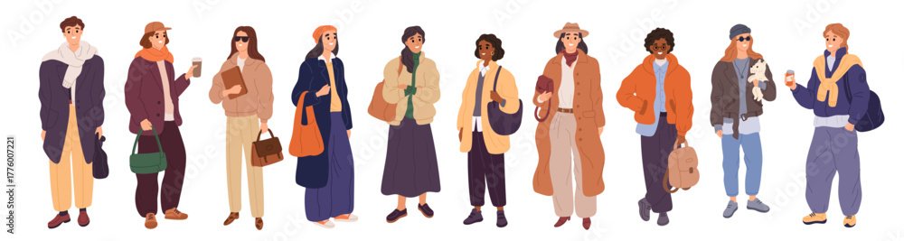 People in casual modern clothes. Women and men with demi season street looks, multi layered outfits, current images wears, coats and boots. Cartoon flat style isolated garish vector set #1776007221