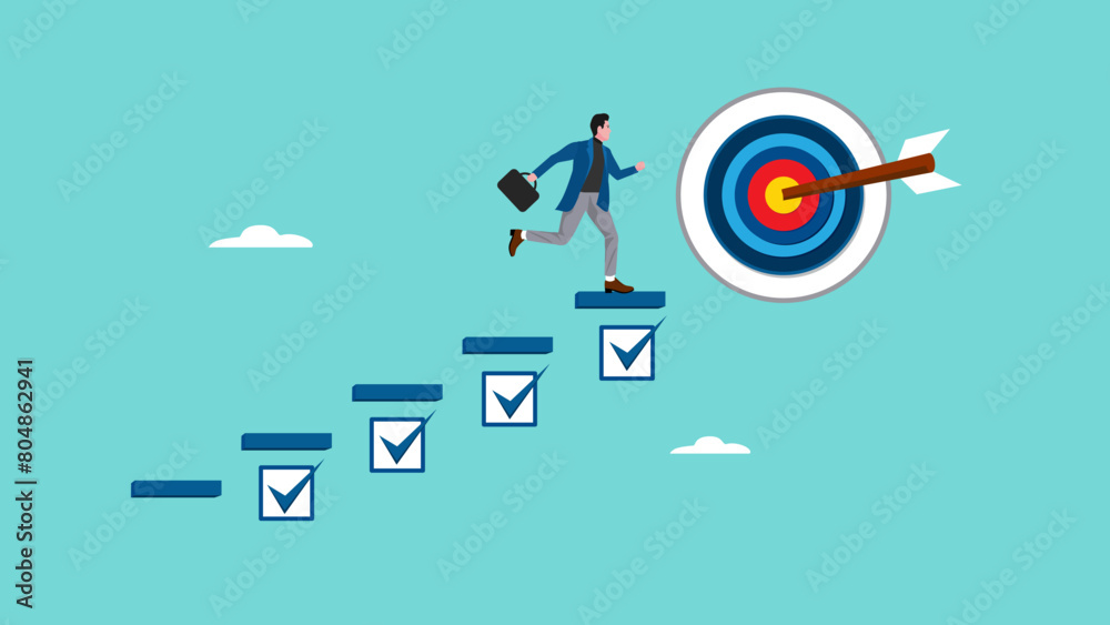 personal development goals for work, train specific skills or competencies to achieve career success, self improvement or career growth, Businessman walk up checklist as a ladder to reach target #804862941