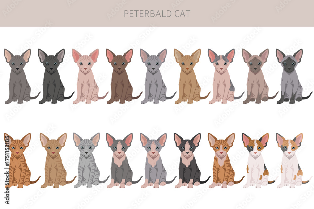 • #1751153185 Peterbald cat, Russian Sphynx clipart. All coat colors set. All cat breeds characteristics infographic. Vector illustration