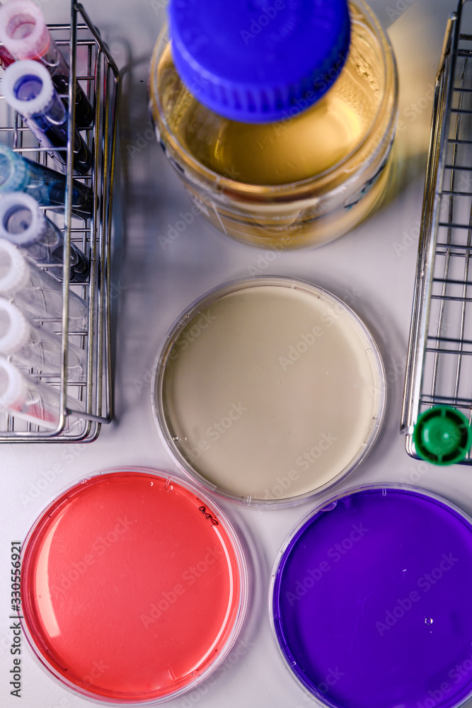 Petri dishes, test tubes and laboratory equipment, with coloring liquids. Concept of science, laboratory and study of diseases. #330556921