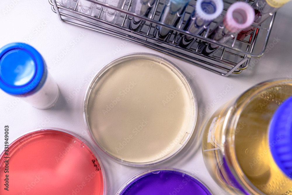 Petri dishes, test tubes and laboratory equipment, with coloring liquids. Concept of science, laboratory and study of diseases. Coronavirus (COVID-19) treatment developing. #331949003