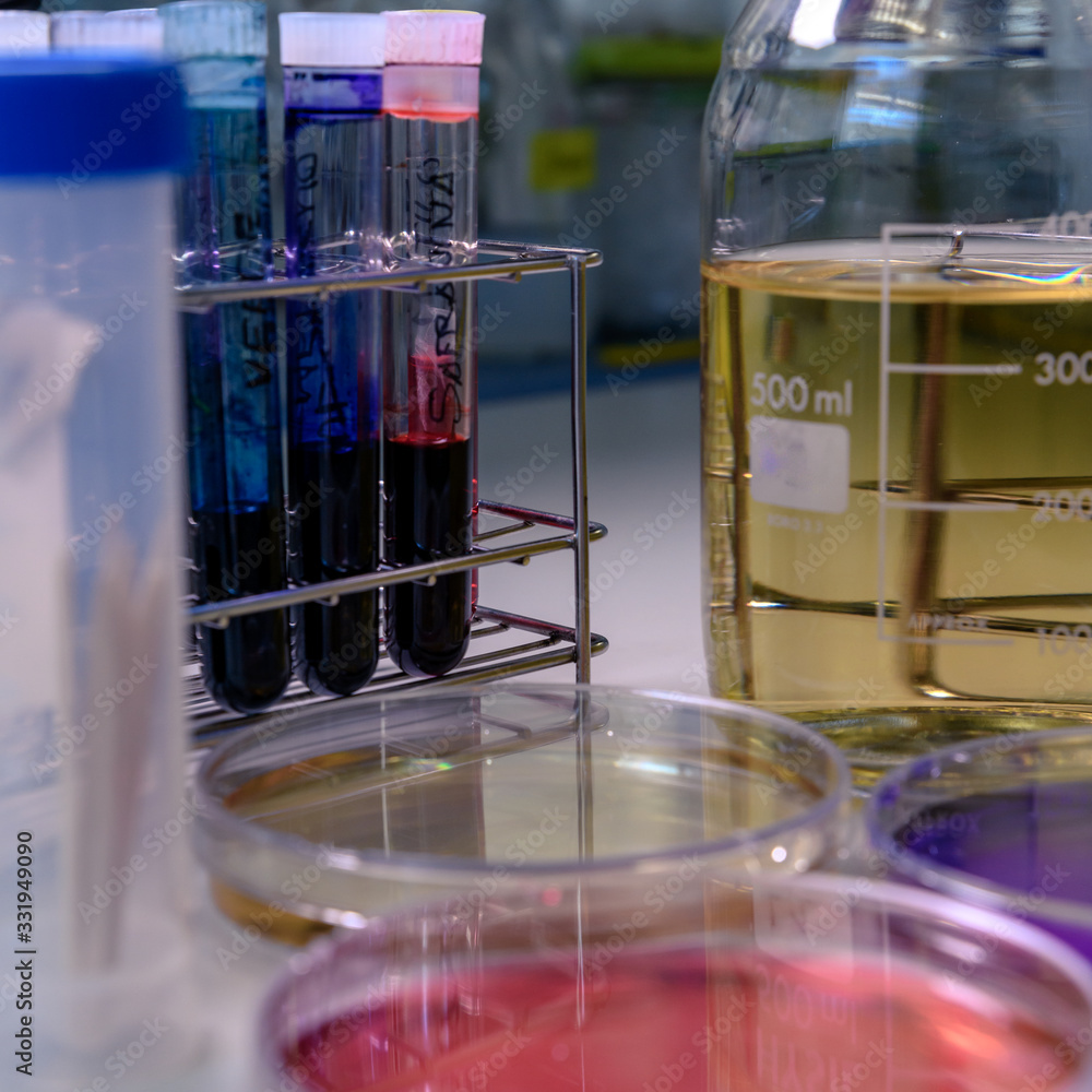 Petri dishes, test tubes and laboratory equipment, with coloring liquids. Concept of science, laboratory and study of diseases. Coronavirus (COVID-19) treatment developing. #331949090