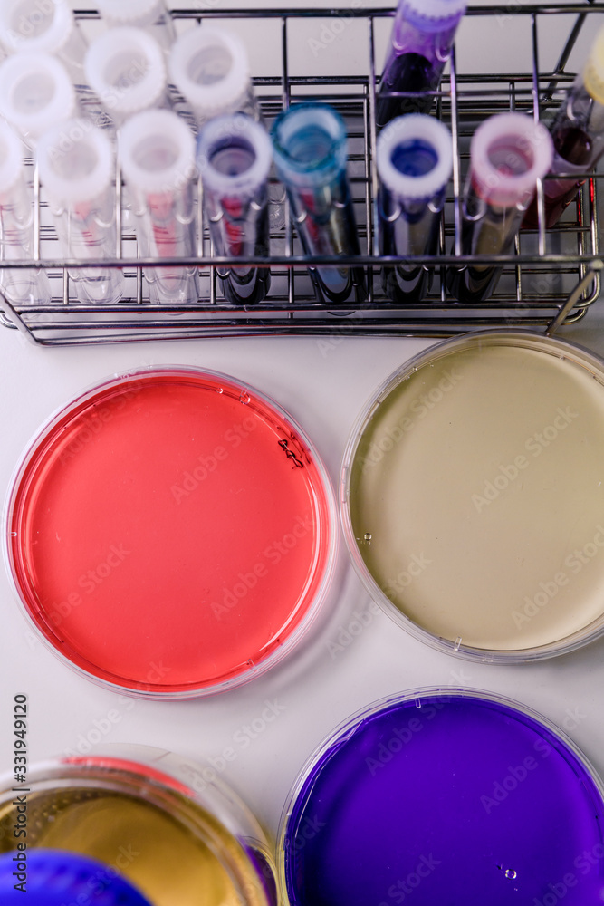 Petri dishes, test tubes and laboratory equipment, with coloring liquids. Concept of science, laboratory and study of diseases. Coronavirus (COVID-19) treatment developing. #331949120