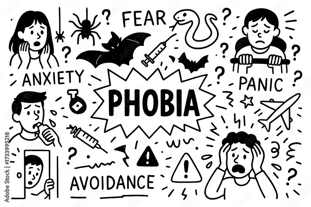 phobia concept with fearful faces, spiders, snakes and ghost doodle icons, Transparent Background #1733995218