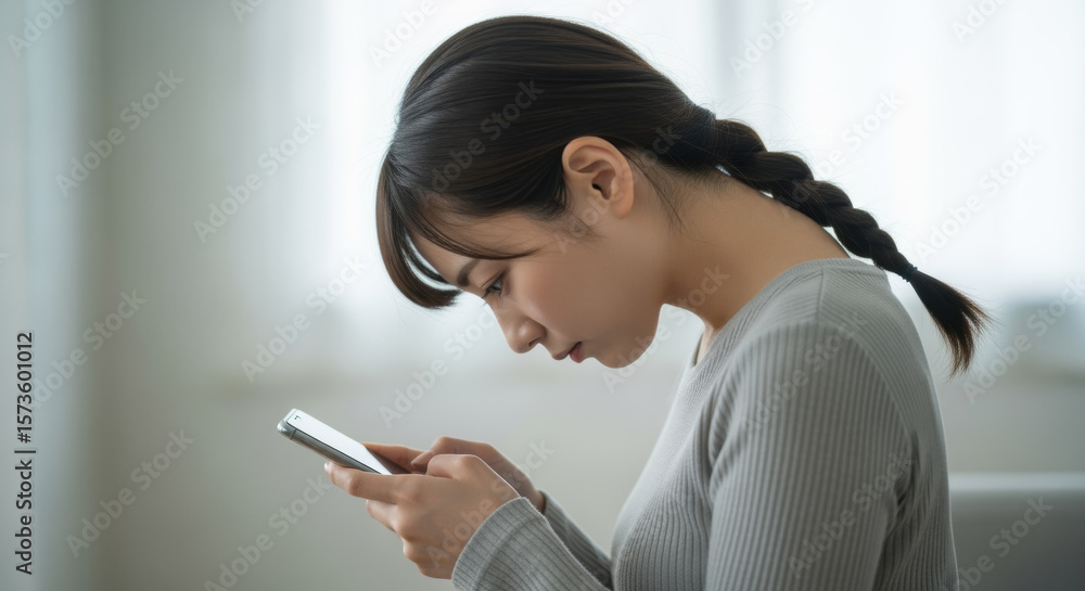 スマホを操作する若い女性 ストレートネック スマホ首 #1573601012