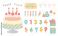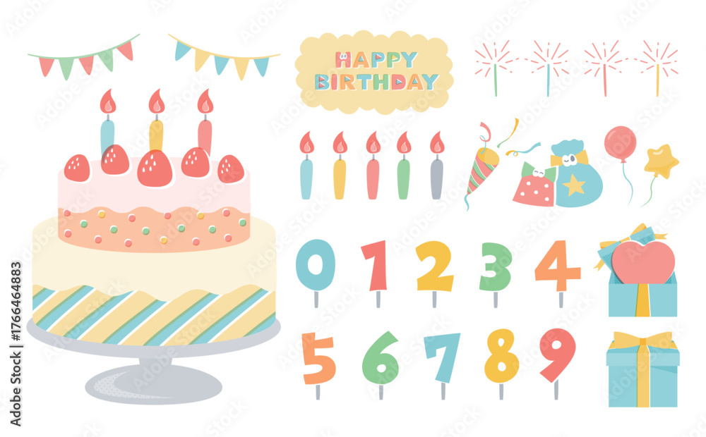 誕生日祝いに使えるこども向けカラフルな誕生日ケーキのポップなイラストと手書きフォント素材セット #1766464883