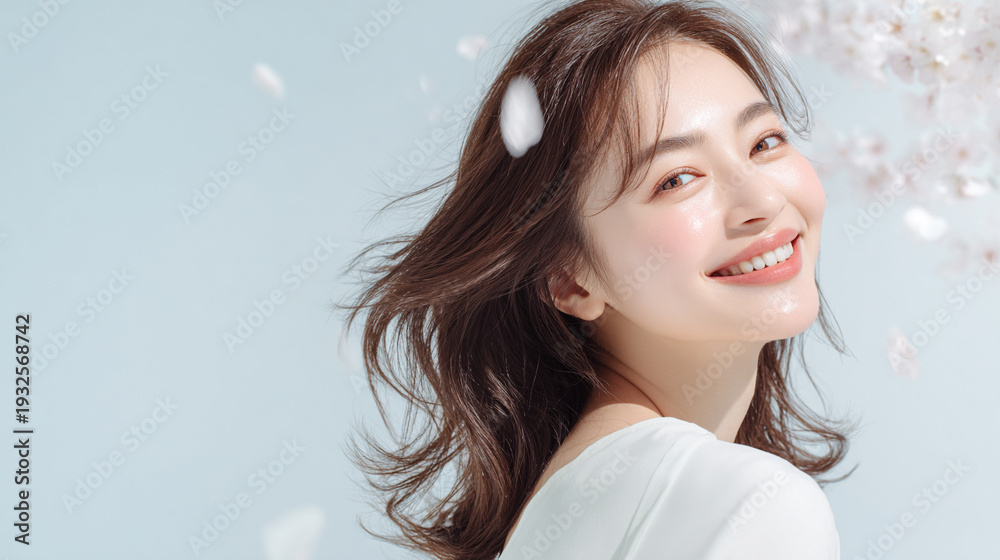 美しい肌の女性と桜が舞う春の背景 #1932568742