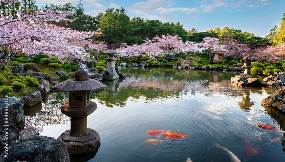 鯉のいる池、石灯籠、満開の桜が調和した静かな日本庭園 #939463106