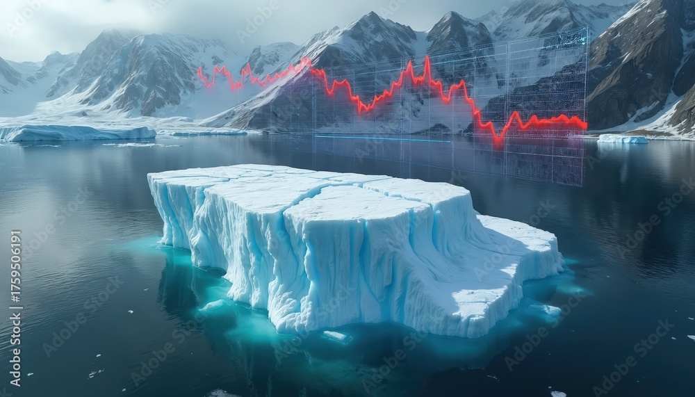 Photo shows melting glacier with economic graph superimposed. Visualizes environmental changes, climate impact. Global warming, effect on finance industries apparent. Image crisis. #1759506191