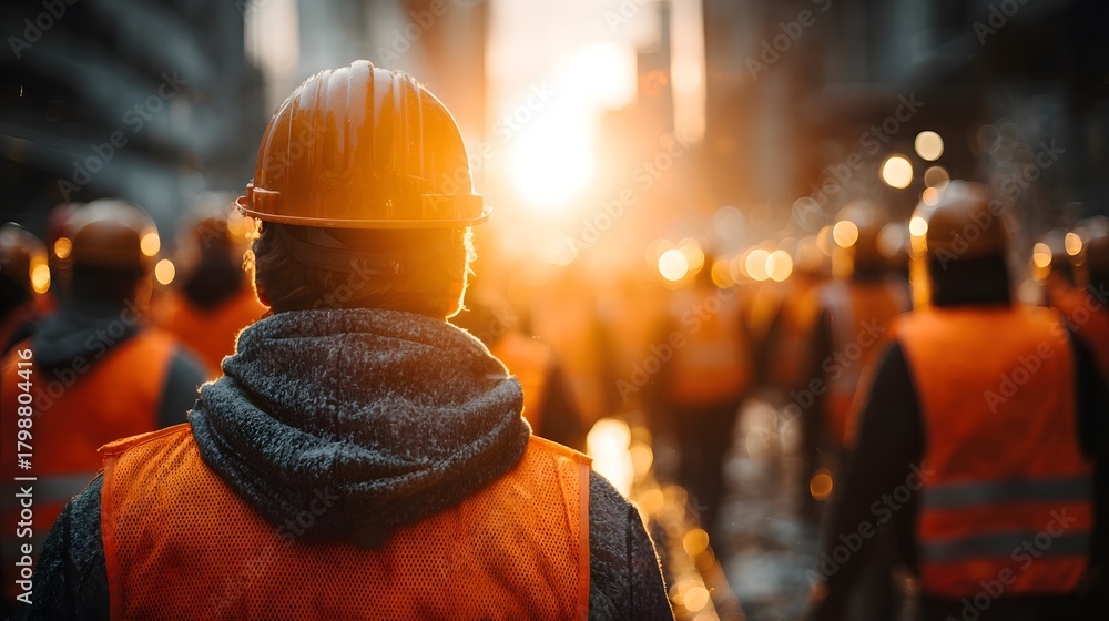 Photograph from behind construction workers in safety vests walking on-site, as the sun flares brightly behind them, creating a hopeful, powerful mood. #1798804416