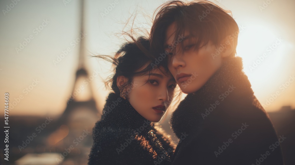 Photorealistic Chinese fashion model couple at Paris Eiffel Tower during golden hour sunset, elegant haute couture outfits. #1477744603