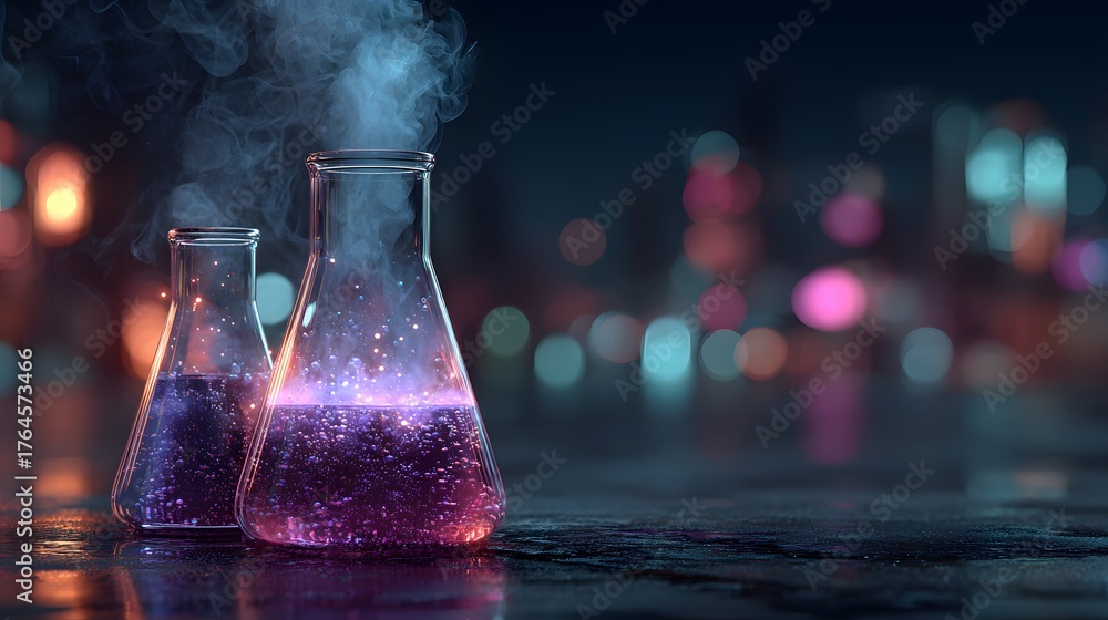 Photorealistic glowing glass chemistry beakers hold shimmering lavender liquid, one emitting mystical smoke, set in a futuristic lab with neon lights. #1764573466