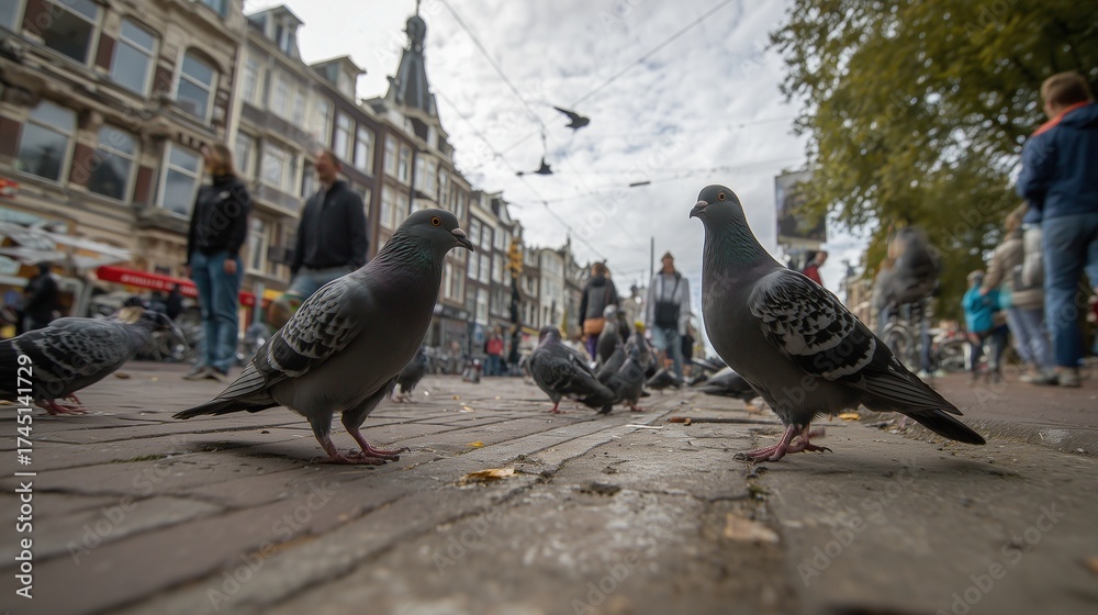 Pigeons roam a bustling city square as a man and a woman stroll by the pigeons. The pigeons peck the ground under the watchful eyes of the man and the woman. #1745141729