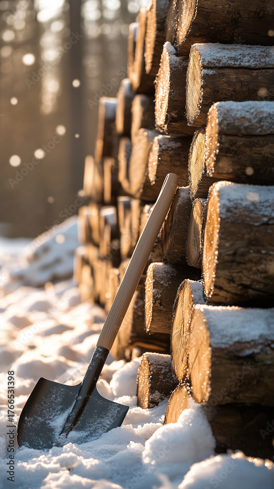 Pile of firewood covered in snow with shovel in winter forest #1766531398