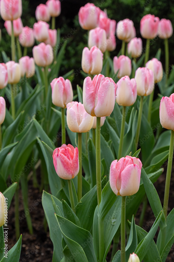 Pink tulips bloom in a garden during springtime near a walking path with trees in the background and a clear sky above #1956383075
