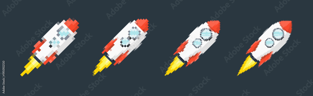 Pixel art rocket with fiery trails, retro games, space-themed designs, apps, or animations. 8-bit style for technology, sci-fi, and futuristic creative projects. Vector illustration #1950102130