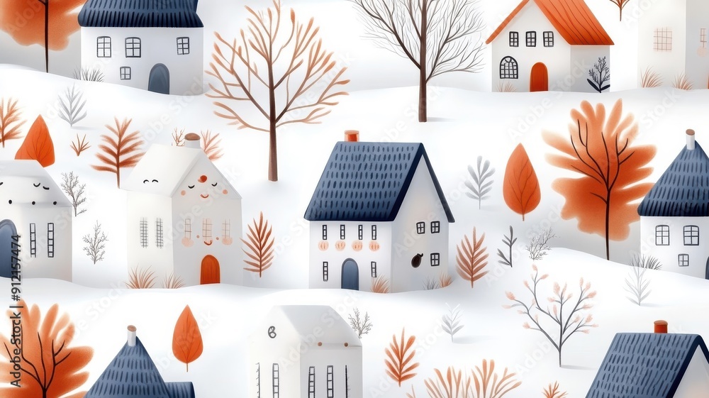 Playful pattern with anthropomorphic houses and waving trees. #912157474