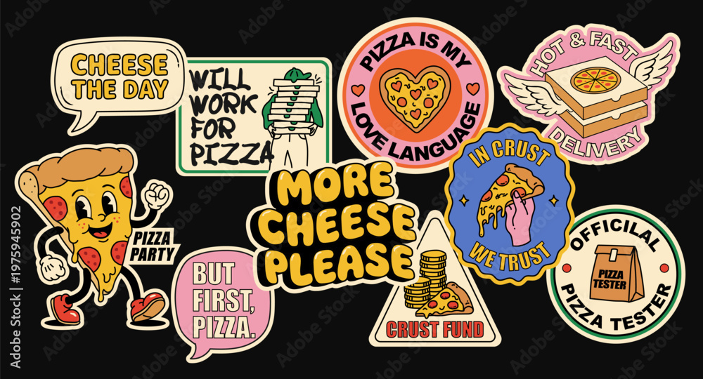 Playful pizza-themed sticker set perfect for pizza lovers and pizzerias, featuring fun phrases and vibrant graphics. Ideal for decorating or promoting all things pizza #1975945902