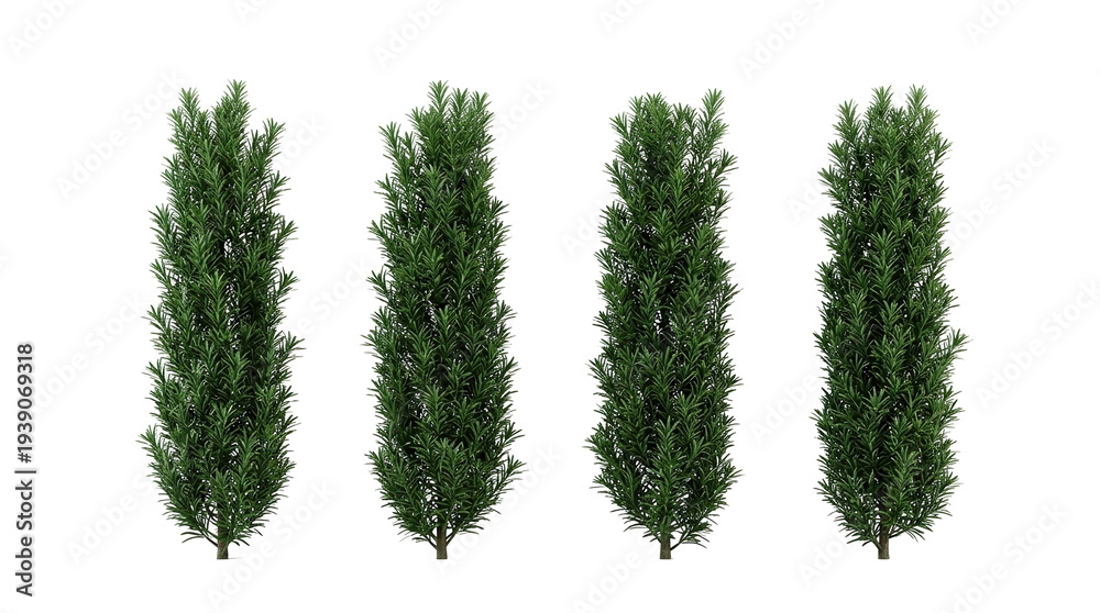 Podocarpus macrophyllus, yew plum pine, buddhist pine, evergreen shrub, columnar tree, garden plant, ornamental foliage, group of four vertical trees isolated on black background. #1939069318
