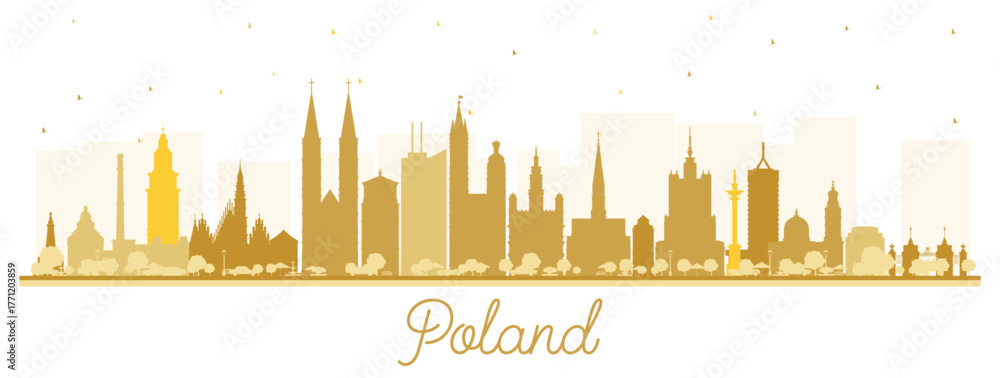 Poland City Skyline silhouette with golden Buildings isolated on white. Illustration. Concept with Modern Architecture. Poland Cityscape with Landmarks. Warsaw. Krakow. Lodz. Wroclaw. Poznan. #1771203859