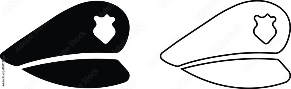 Police officer hat icon set in flat, outline styles. Military and security uniform cap silhouettes collection, law enforcement headwear vectors for authority design isolated on transparent background. #1969288261