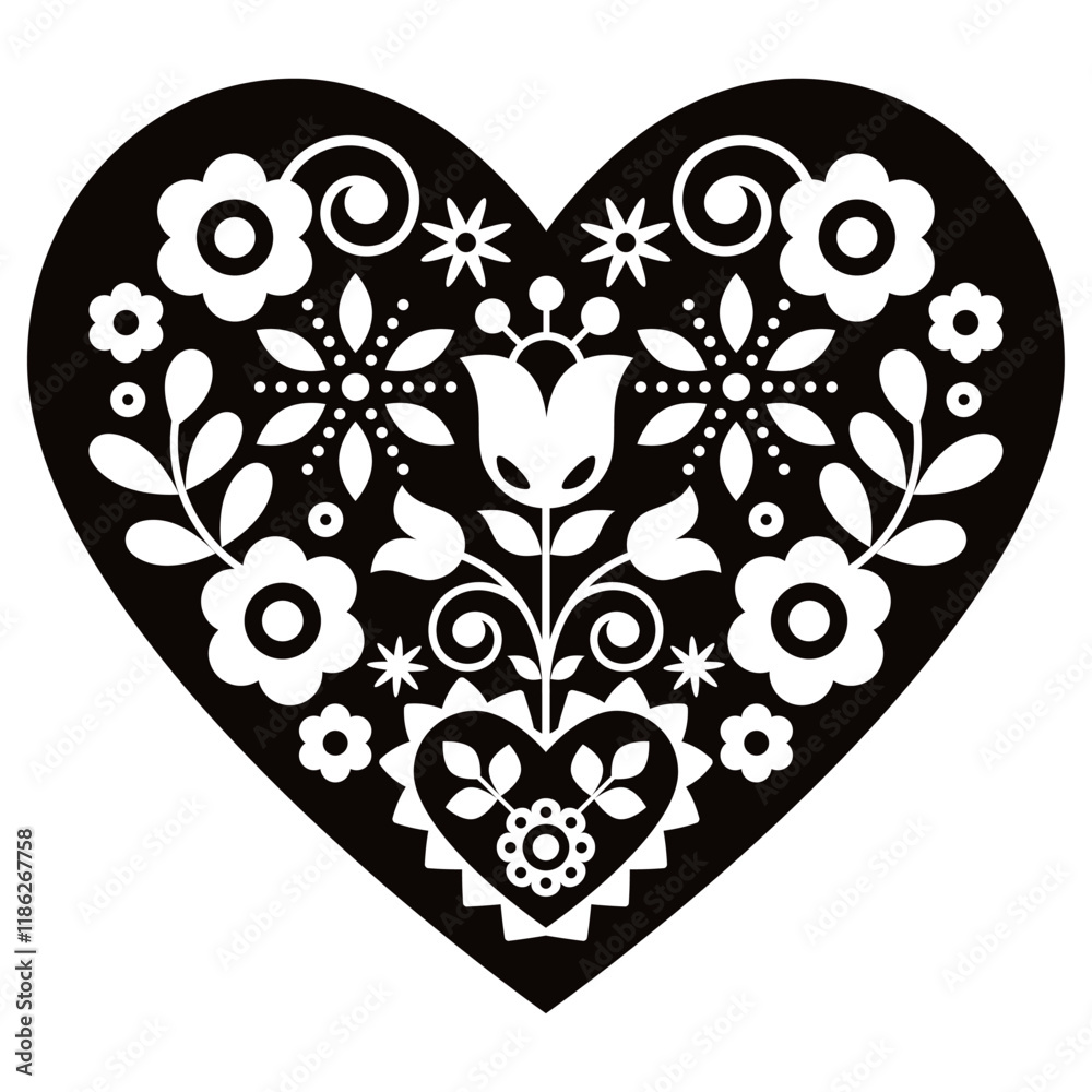 Polish cute floral folk art vector heart design with flowers perfect for Valentine's Day greeting card or wedding invitation - black and white pattern #1186267758