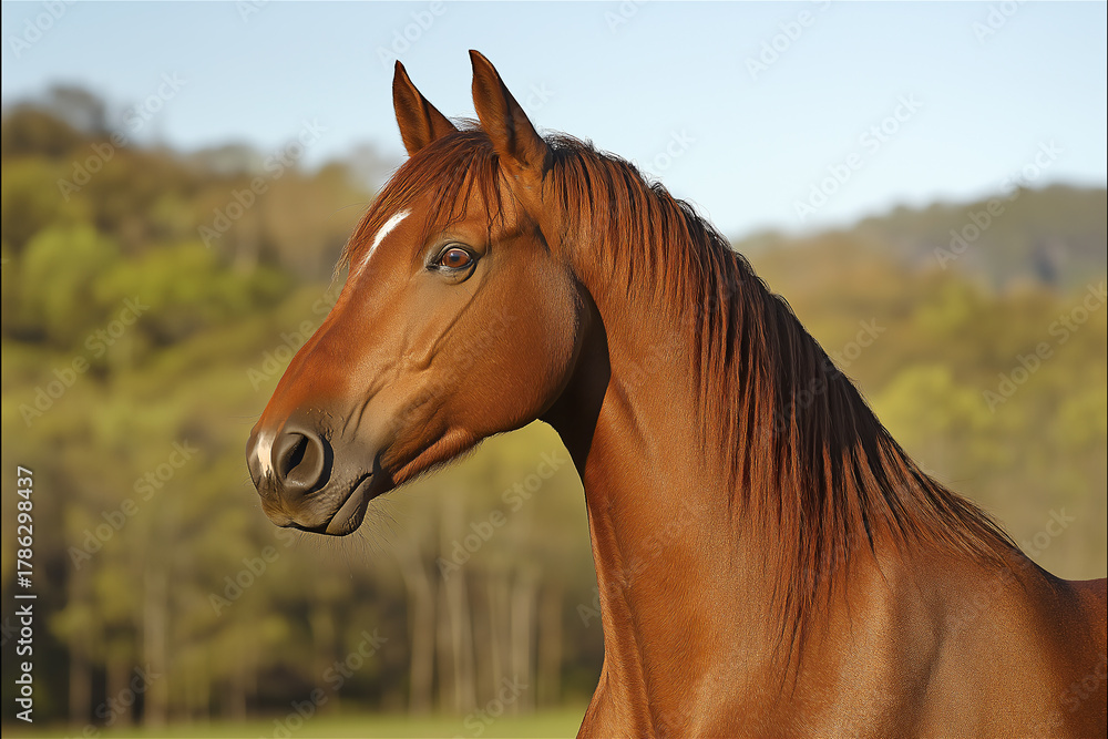 Portrait of a brown horse standing in sunlight against a blurred natural background. The scene captures gentle strength and rural life, perfect for equine or agricultural concepts. #1786298437